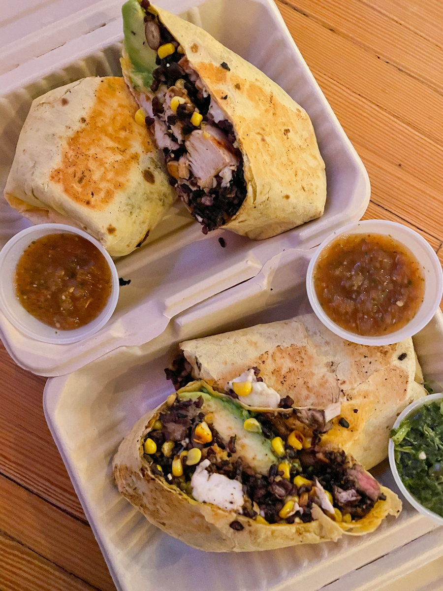 Their bowls are delicious and likely their most popular menu items, but I’ve also had their burritos and burgers and can vouch for both of those as well. The burrito is a standout, with forbidden rice, avocado, soft cheese, and your choice of protein.