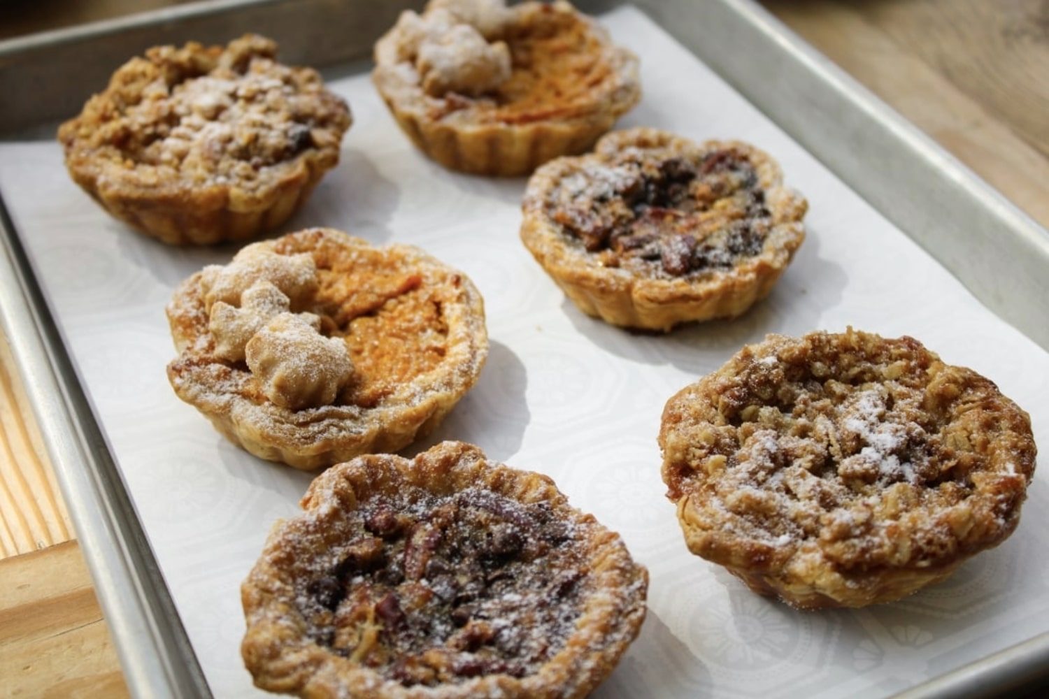 Tiny Pies’ Thanksgiving lineup features everything from their 12-pack mini assortment to “Not So Tiny” pies like Pumpkin Chai, Pumpkin Cheesecake, Apple Crumb, and Chocolate Cream. Pickup: Nov 24–26